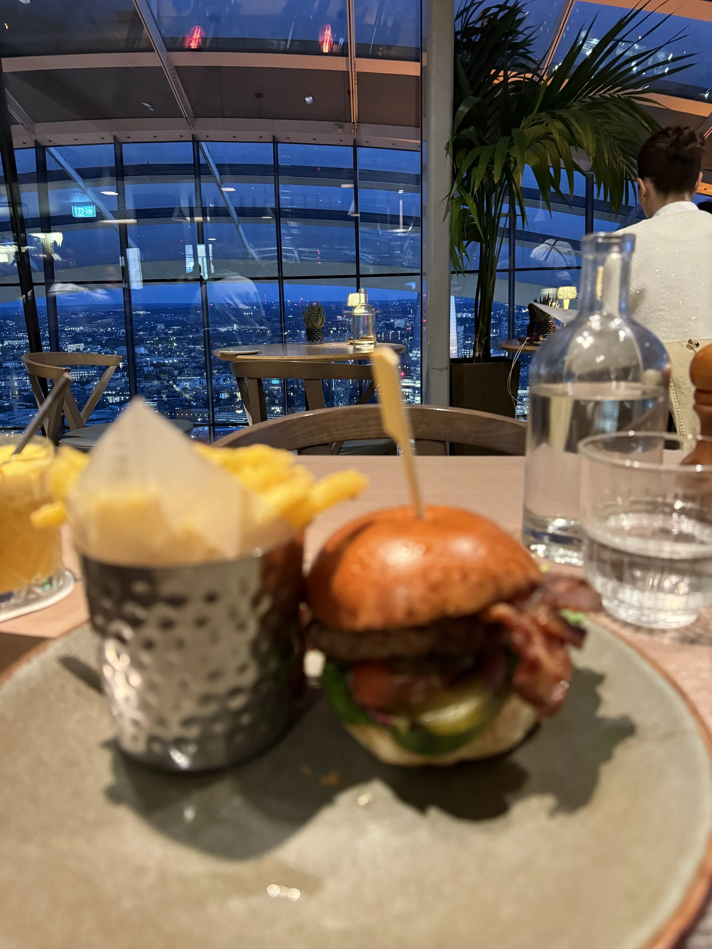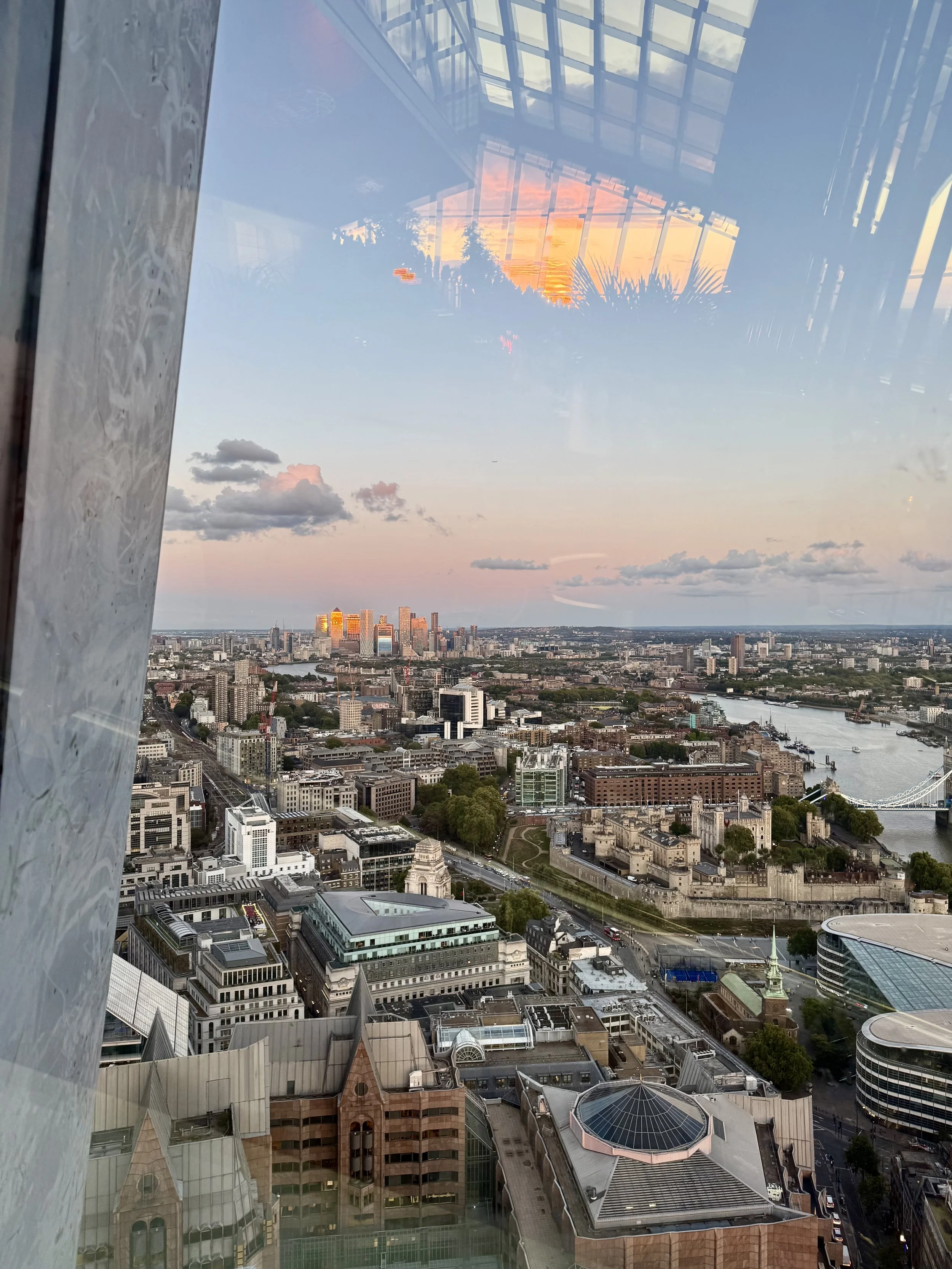 London’s highest public garden boasting 360-degree skyline views through three-story windows on the building’s rooftop.